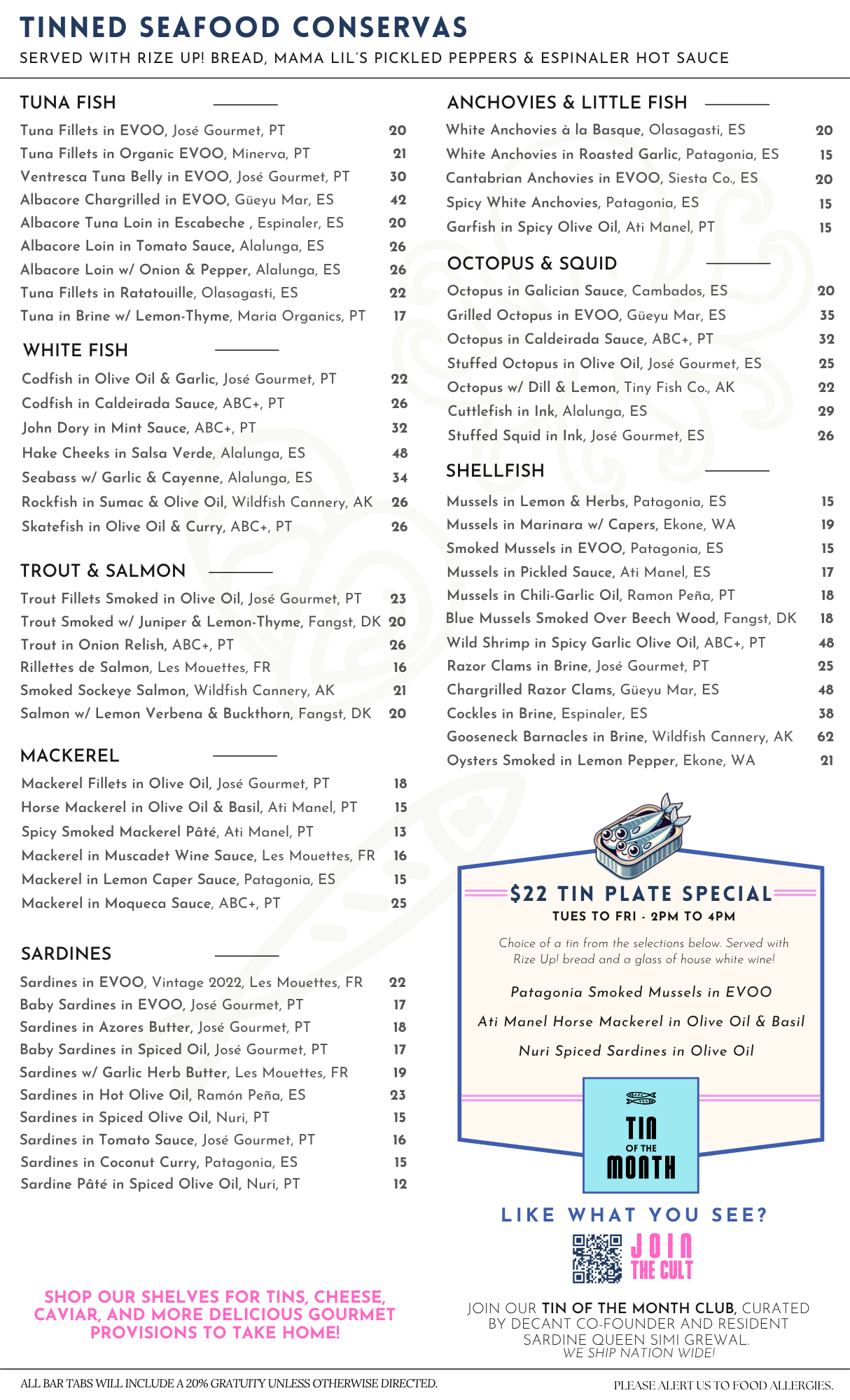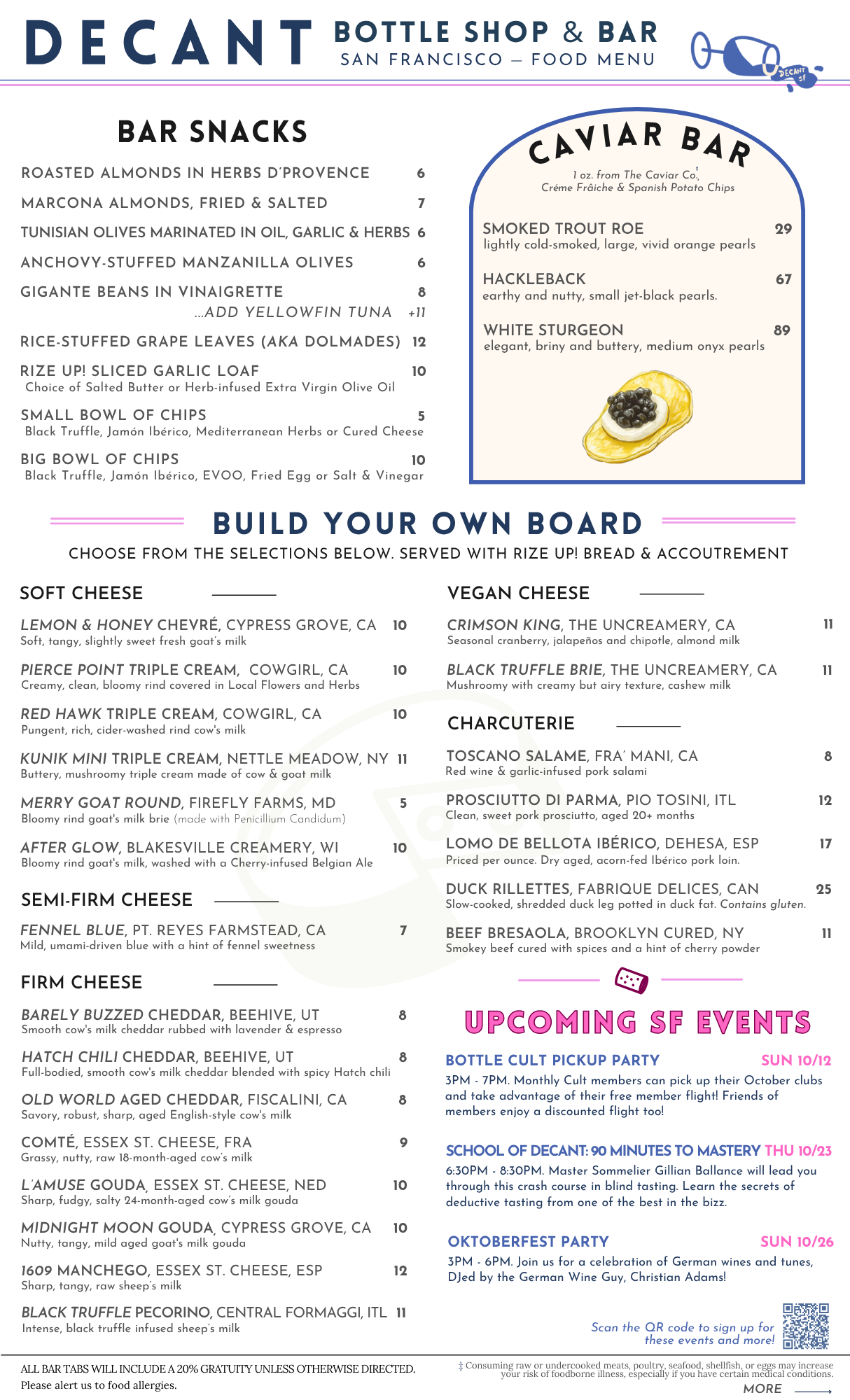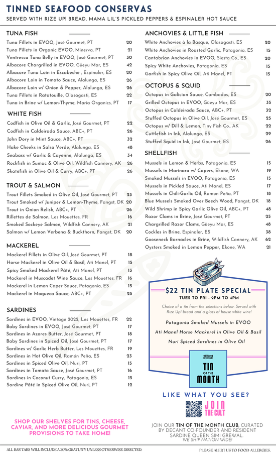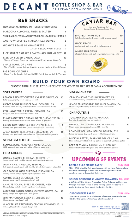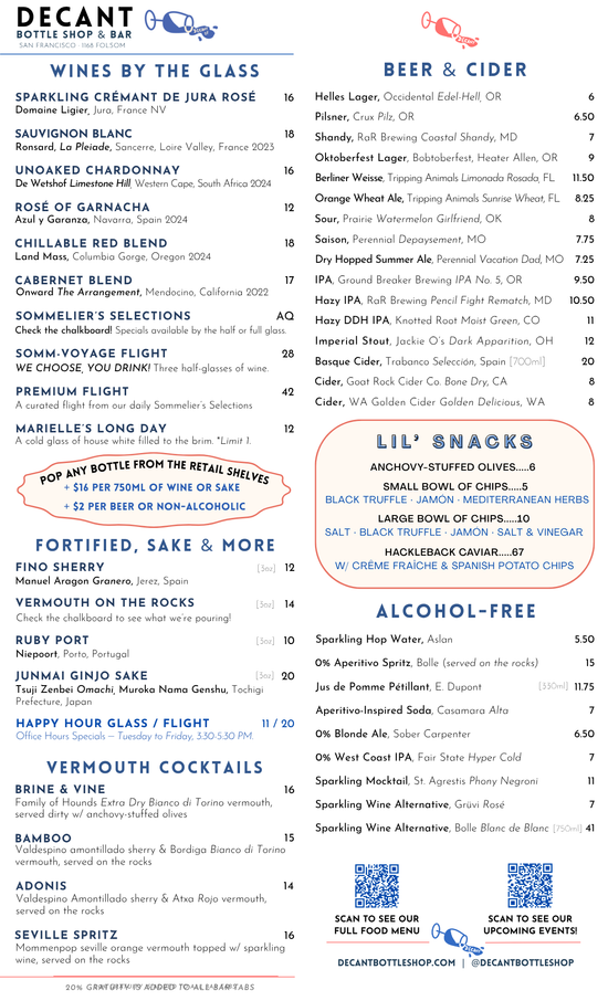 DECANTsf is 21+ only. 20% service is added to all bar tabs. All items are available for retail sale, too!